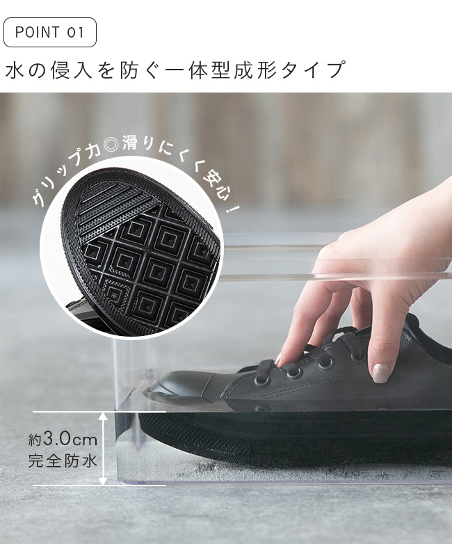 地面から約3.0cmまでの水の侵入を防ぐ!全体を一度に作る一体型成形タイプ。 全体がラバー素材なので水が隙間から入り込まず長時間のお出かけにも安心して使えます。 靴底は、しっかりとした凹凸とPVC素材(ポリ塩化ビニル)のため、グリップ力が高く滑りにくいので、安心して歩いていただけます。 ※低温の冬場や雪の場合は滑ることもございます。