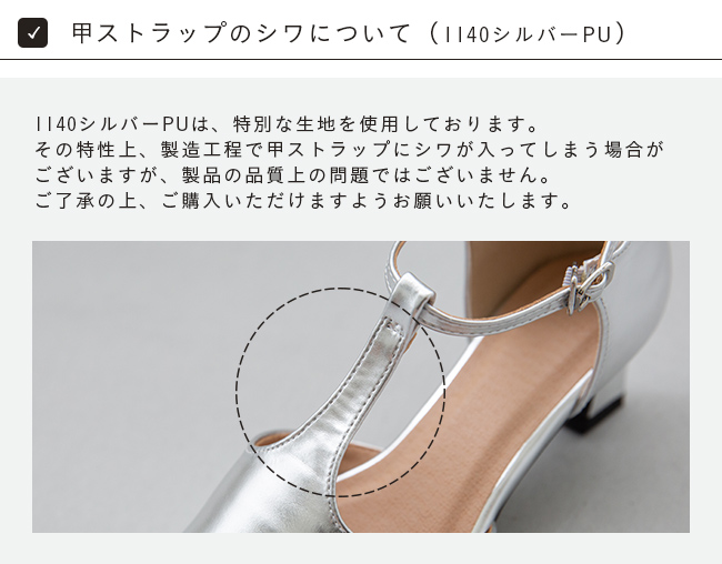 ※1140シルバーPUは、特別な生地を使用しています。その特性上、製造工程で甲ストラップにシワが入ってしまう場合がありますが、製品の品質上の問題はありません。