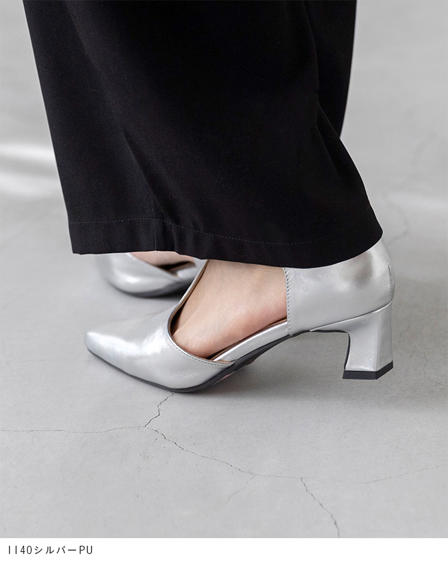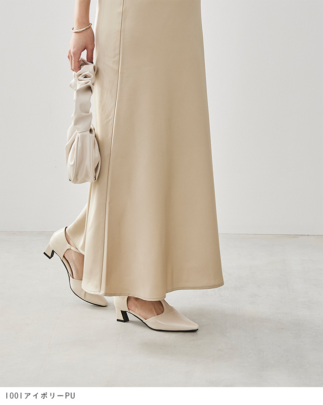 きゅっと内側に傾斜したデザインヒールがアクセント。