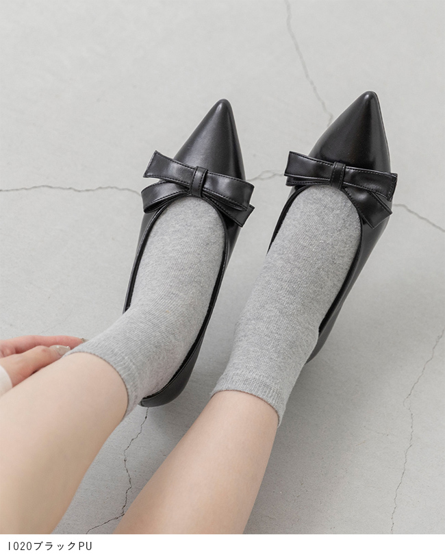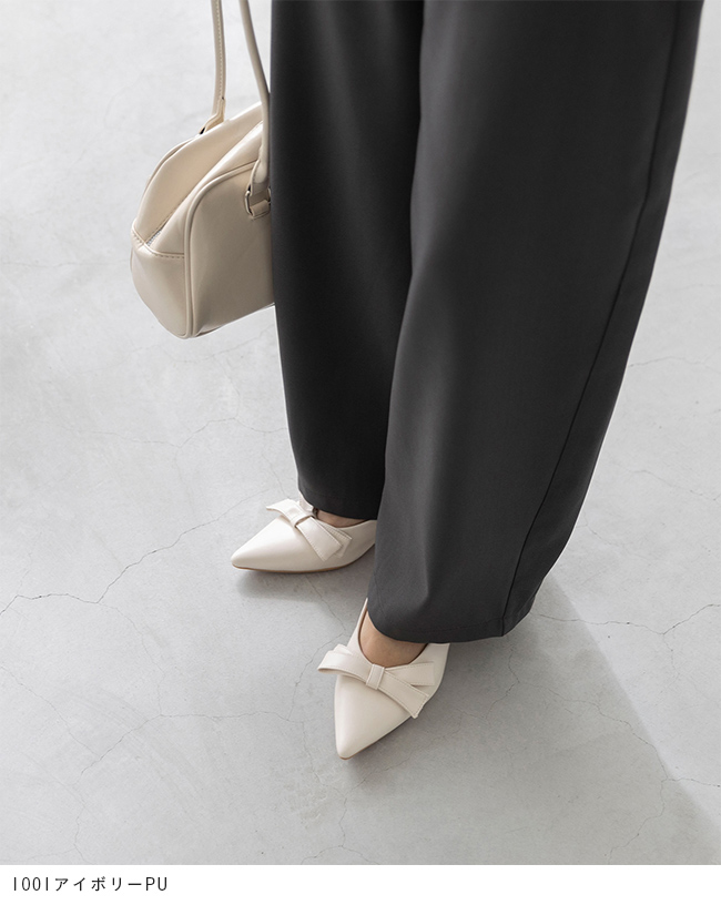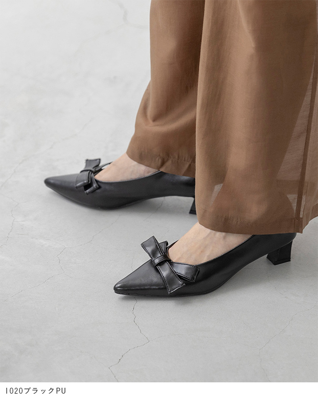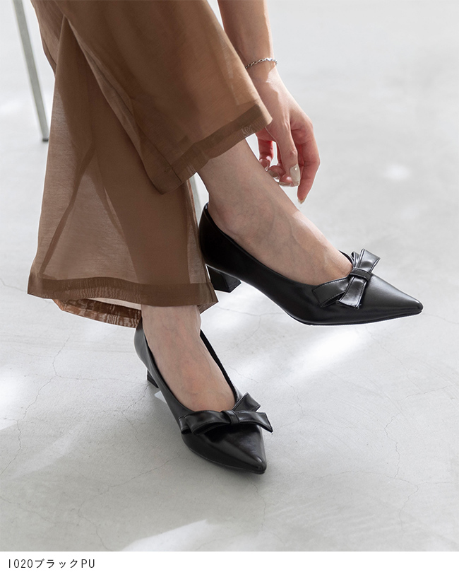 アクセントになるリボンモチーフとちょうどいい高さのヒールが、こなれた大人の足元を演出するポインテッドトゥ。