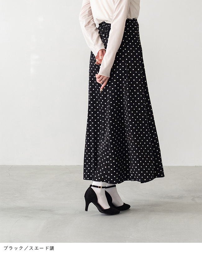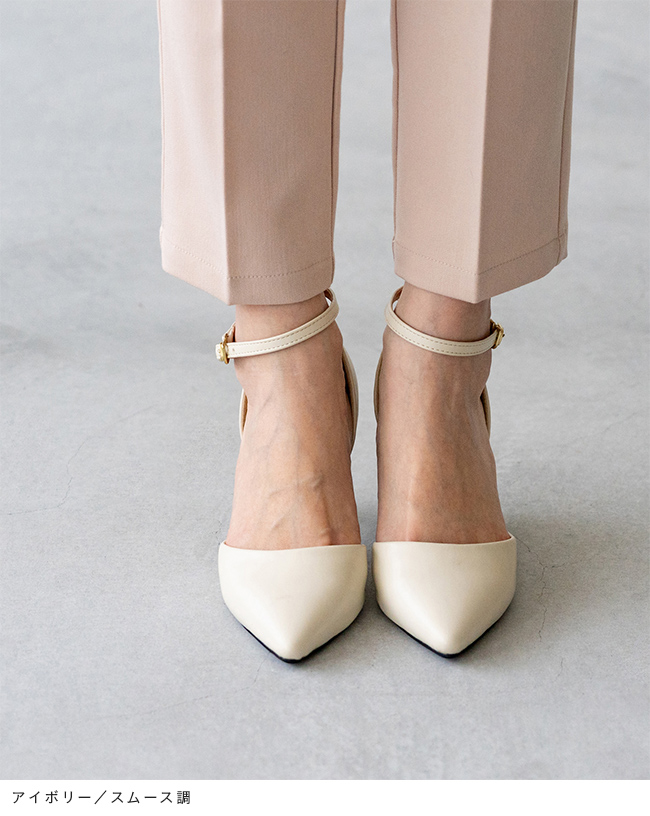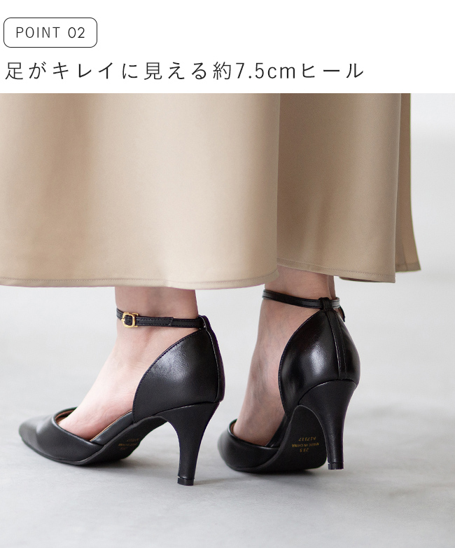 細めのヒールがエレガントさを引き立て、脚をすらりと長く美しく魅せてくれます。