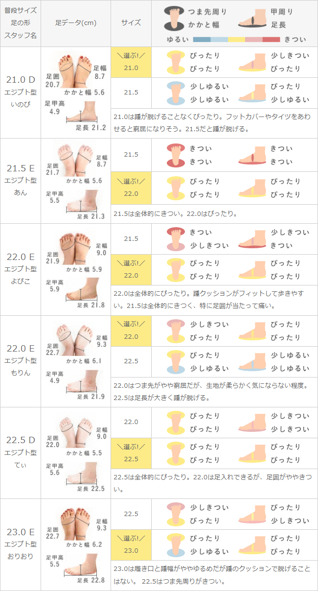 24.5は足長がややゆるいので、ハーフインソールで調節するとぴったり。24.0は足囲とつま先がきついので選ばない。