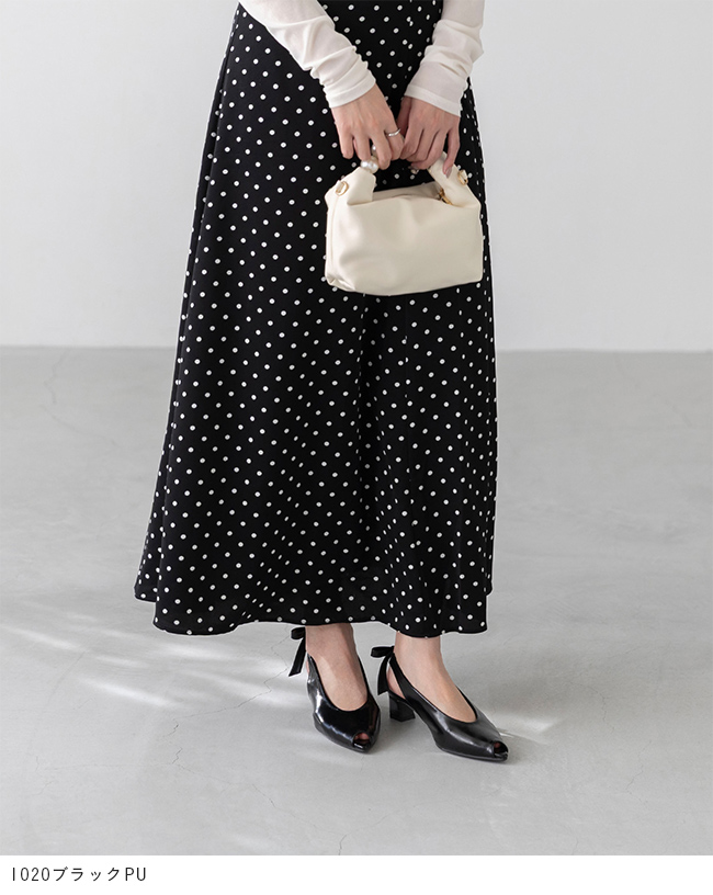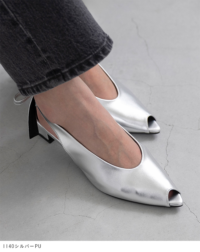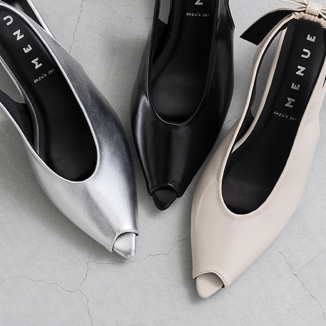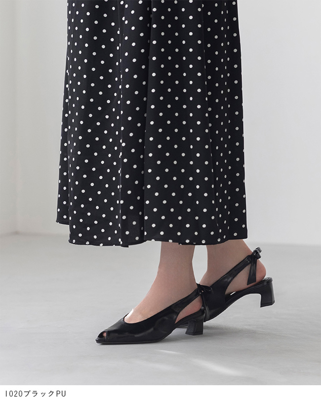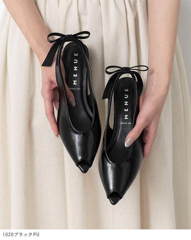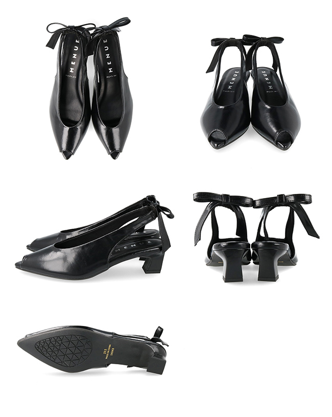 大きめリボンと変形ヒールをトレンドのピープトゥで抜け感調節