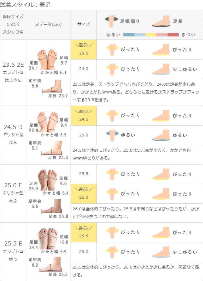 26.0は全体的にぴったり。25.5は甲周りなどはぴったりだが、かかとがややきついので選ばない。
