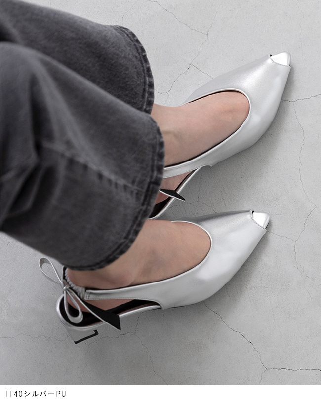 ぱっと目を惹くバックストラップについたリボンはサイズは大きめだが程よい細さでいやらしくない存在感に。