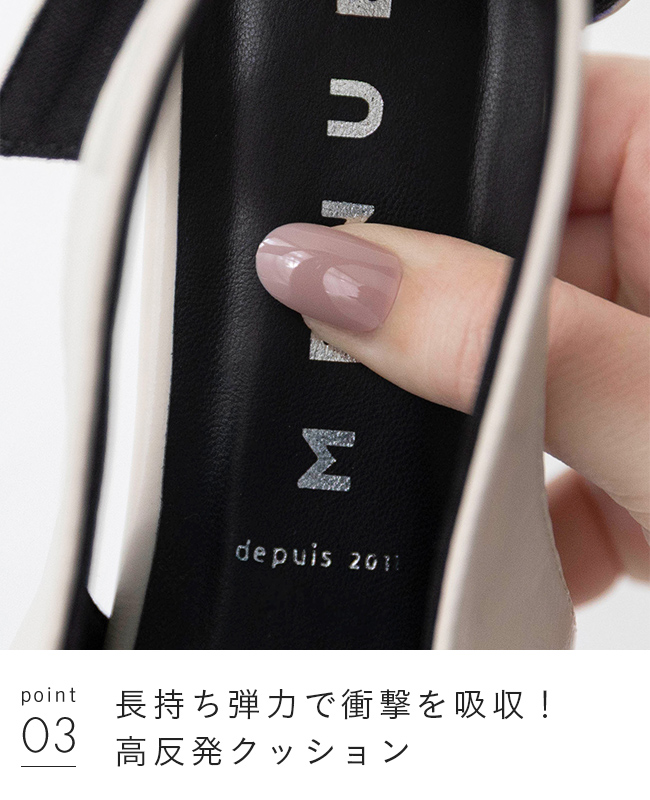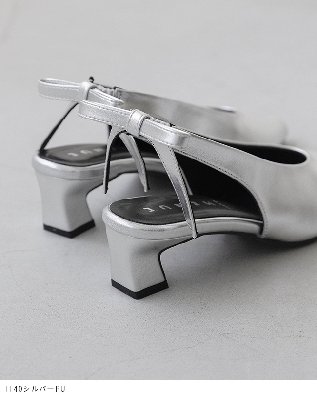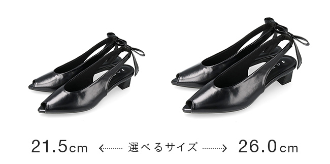 ぱっと目を惹くバックストラップについたリボンはサイズは大きめだが程よい細さでいやらしくない存在感に。変形ヒールでさらに個性をプラスしつつ、トレンドのピープトゥを合わせることで抜け感が出て全体のバランスを調節。個性的なのにスタイリッシュなデザイン性のある1足に仕上がりました。