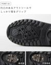 アウトソール(本底)はグリップ力に優れた合成ゴム素材を使用。深い凹凸があるので滑りにくくなっています。かかと部分には収納できる金具のツメが付いているので雪道を歩くときもしっかりと地面をグリップ!