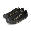 ハトメにくわえ、タンラベルのロゴ、ヒールラベルのロゴ、テープのラインまでゴールドで統一。