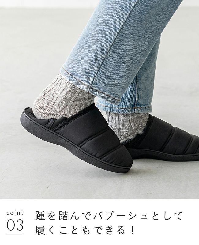 おしゃれなルームウェアやインテリアの雰囲気を損なわない、ほっこりルームシューズを取り入れてみて。