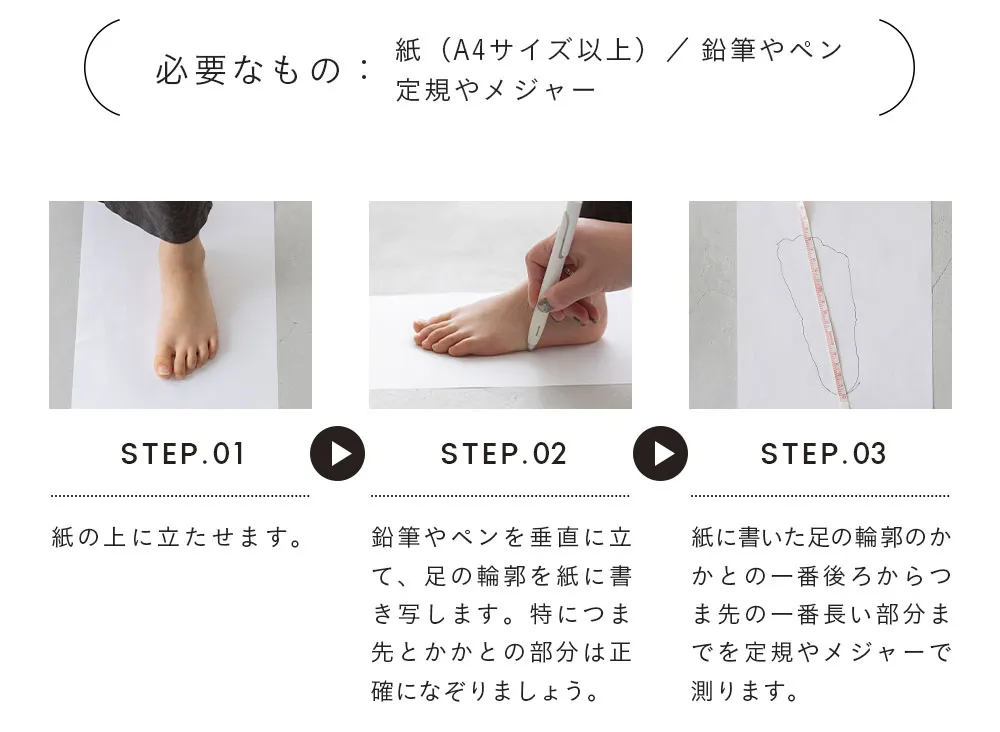 人の足は体重がかかることで少し広がったり長くなったりします。寝ている状態で測ると、本来のサイズより小さく測定されてしまうので注意が必要です。