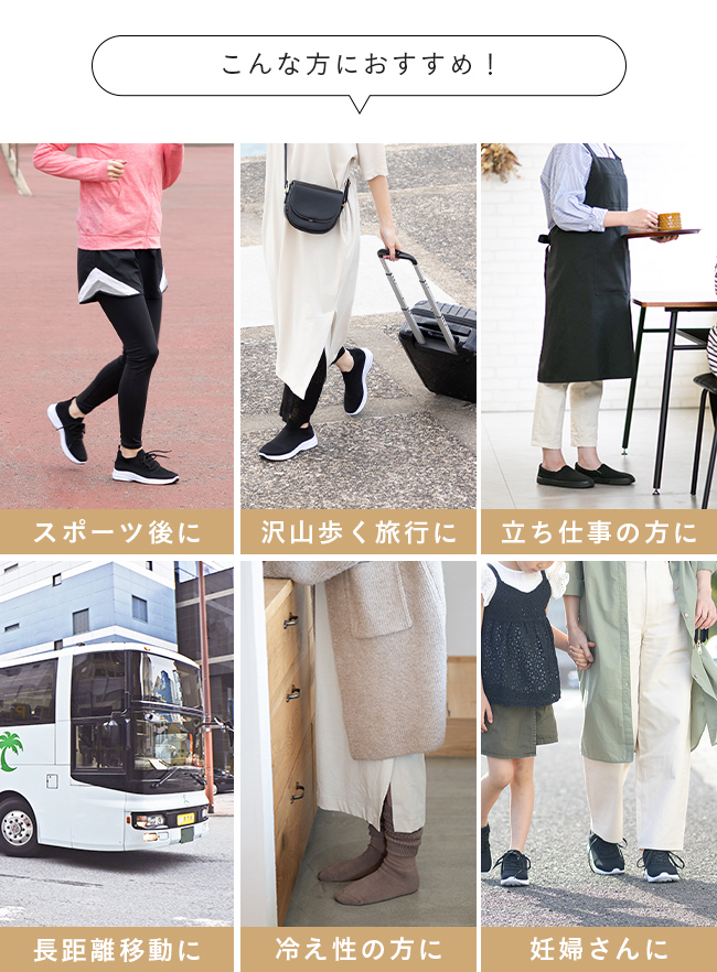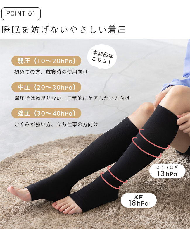 1日働いた足をしっかりケアしてあげられる着圧くつした。寝ているときに履けるやさしい締めつけで疲れを癒してくれます。