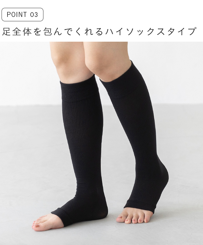ひざ下までしっかりとケアできるハイソックスタイプ。