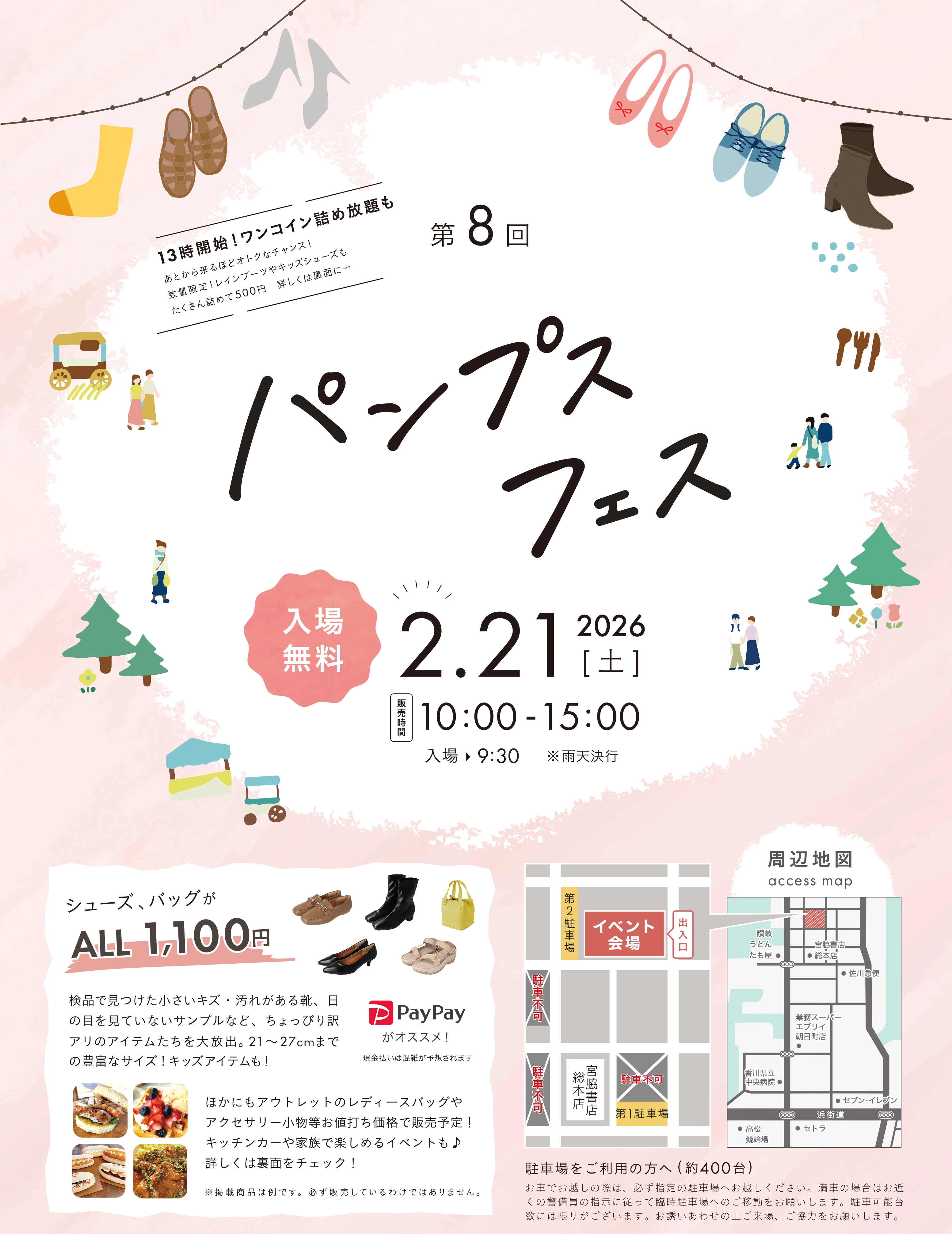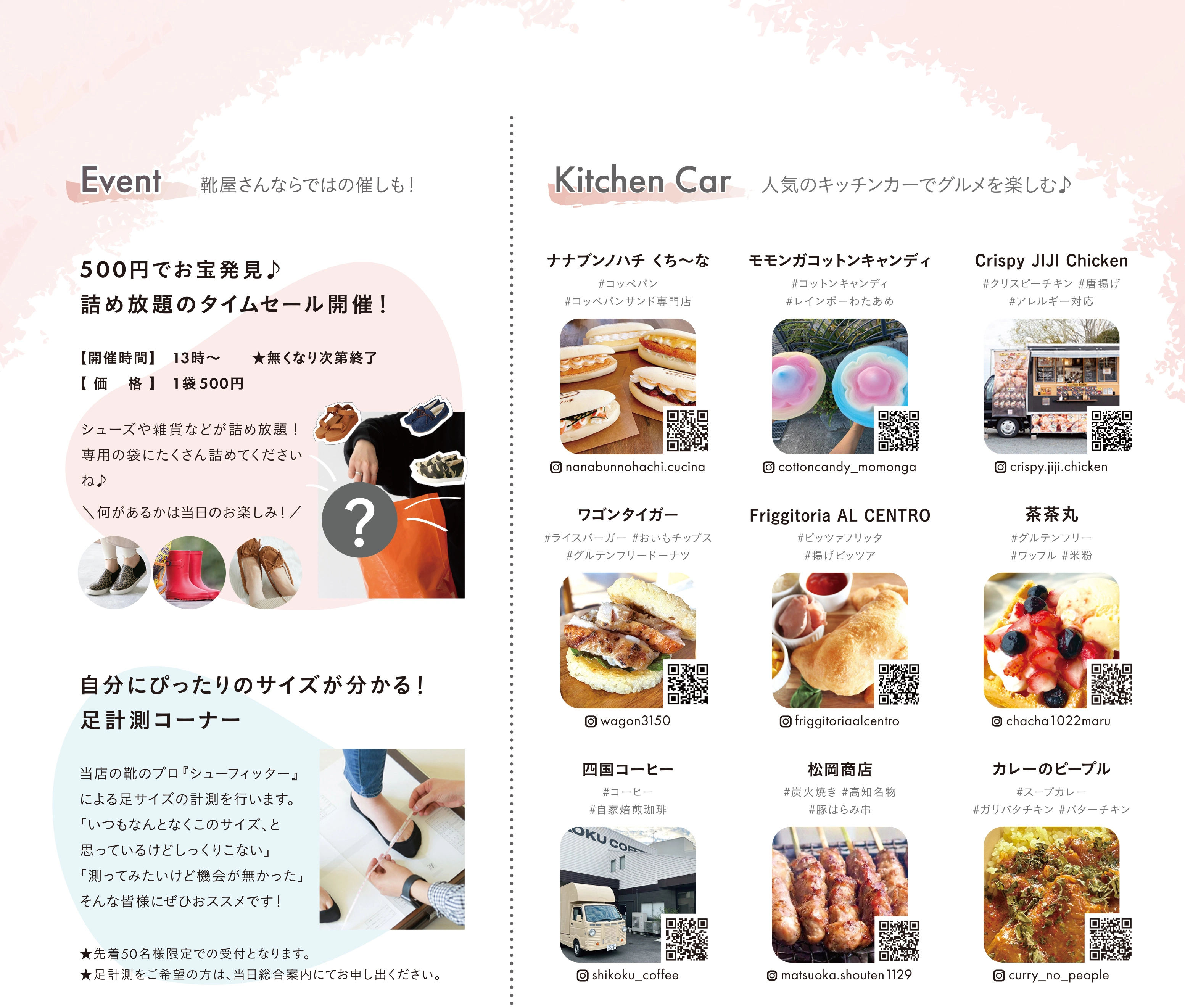 ちょっぴり訳アリアイテムがALL 1,100円! 靴屋さんならではのイベントとして、足計測コーナーやお楽しみイベントもたくさんご用意!香川県で人気のキッチンカーもやってくる!