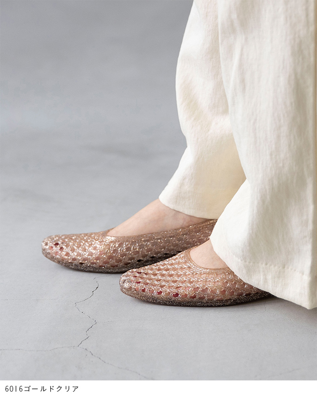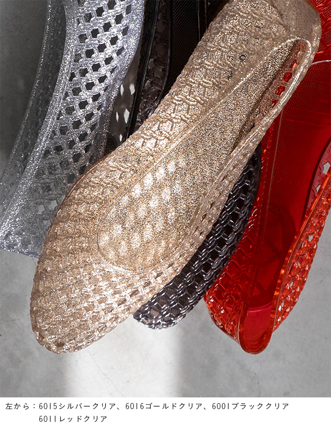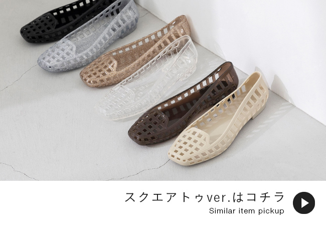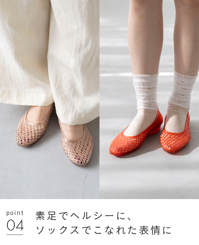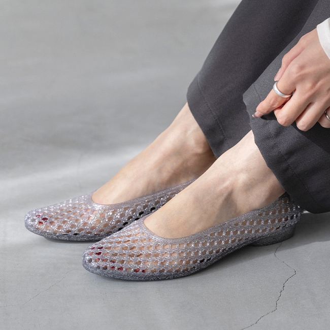 光を反射してキラッと輝くPVC素材なので、素足でもサンダルのように抜け感があり、「シースルー」スタイルが叶います!