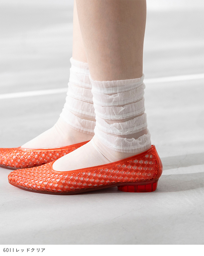 素足でPVCならではの透明感を楽しむのはもちろん、ソックスとのレイヤードでモードに仕上げるのもおすすめです!