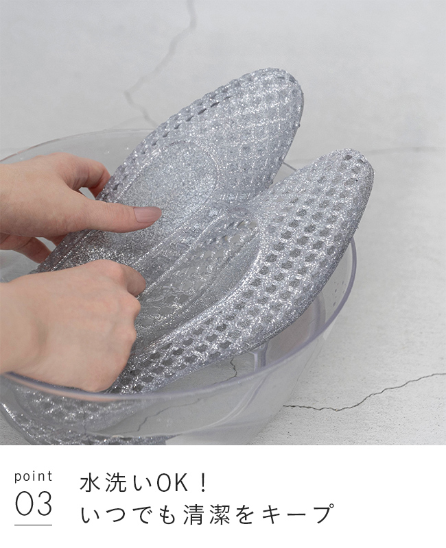 ※本商品はクリア素材の特性上、光の当たり方や角度によって、中敷きが薄く黄色がかって見える場合がございます。