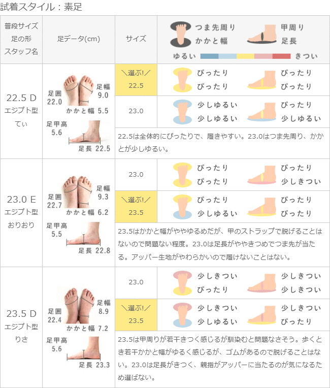 22.5は全体的にぴったりで、履きやすい。23.0はつま先周り、かかとが少しゆるい。