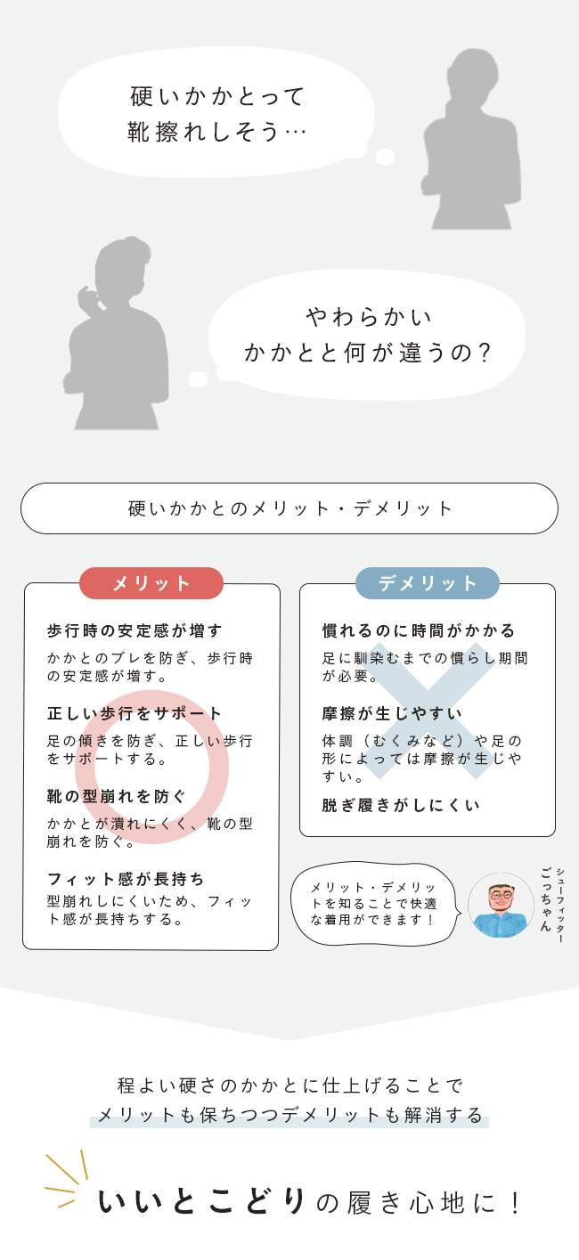 かかと部分は程よい硬さに仕上げることで、歩行時の安定感が増し、ぐらつきを軽減します。