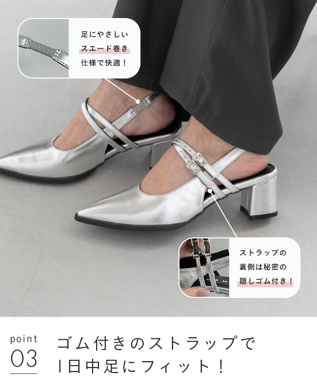 かかとのバックストラップと甲ストラップの裏側はゴム付き!