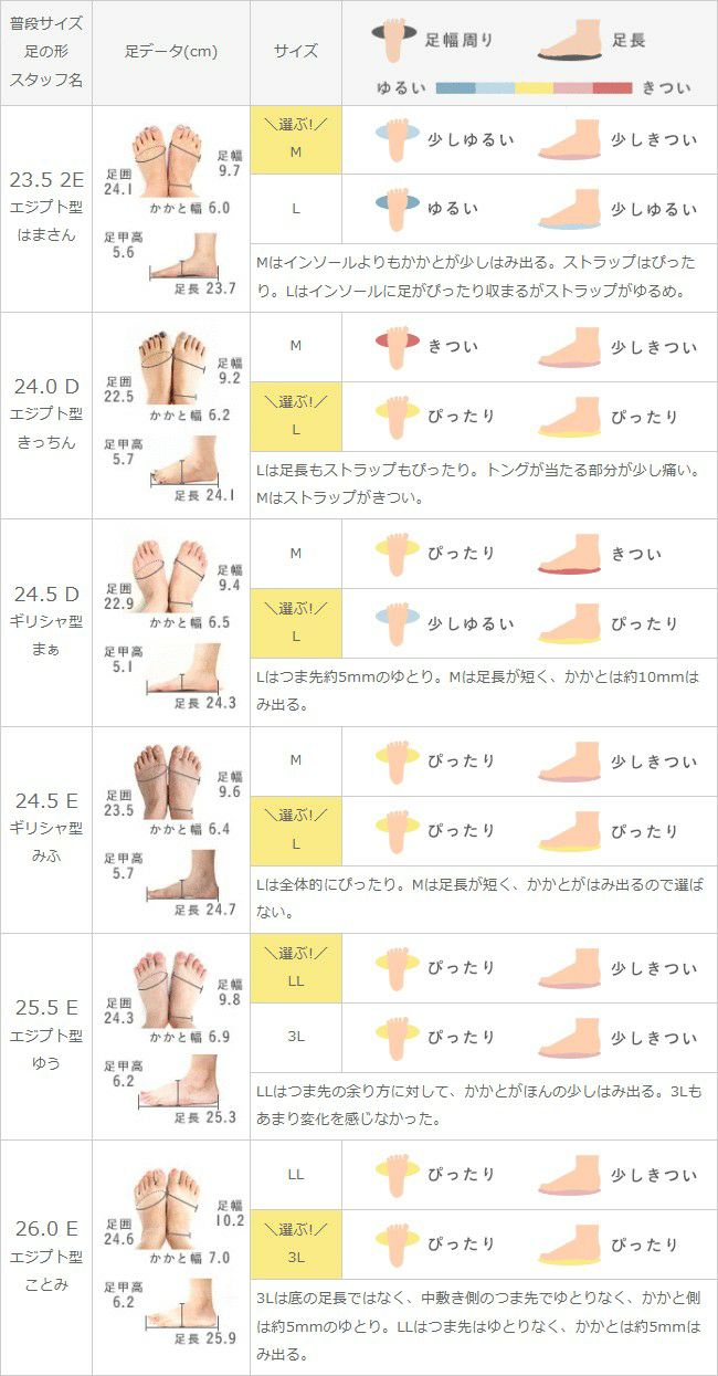 しっかり足にフィットするサイズを選ぶために、試着感想や
