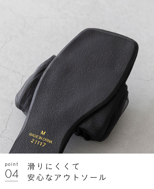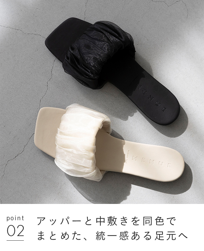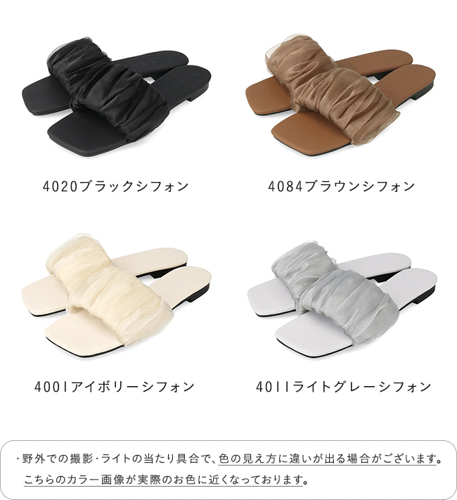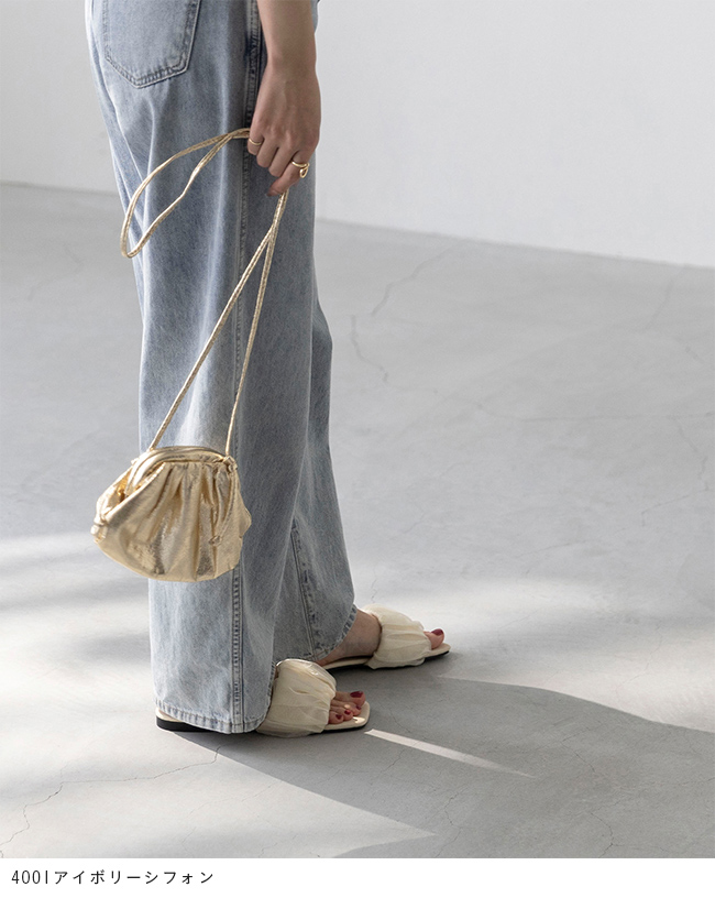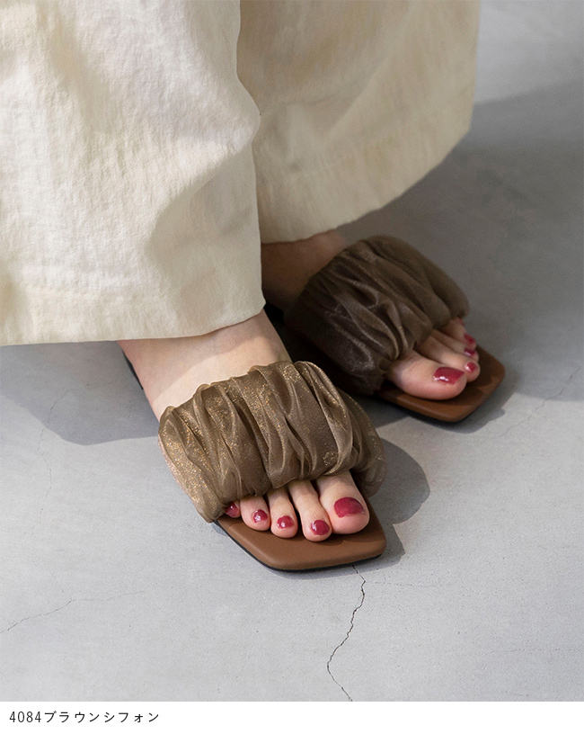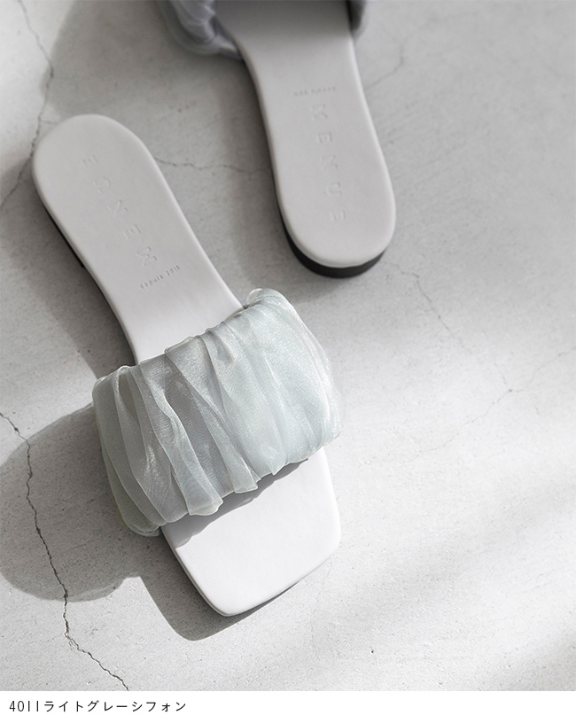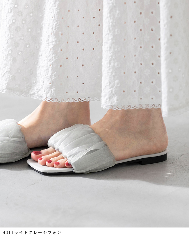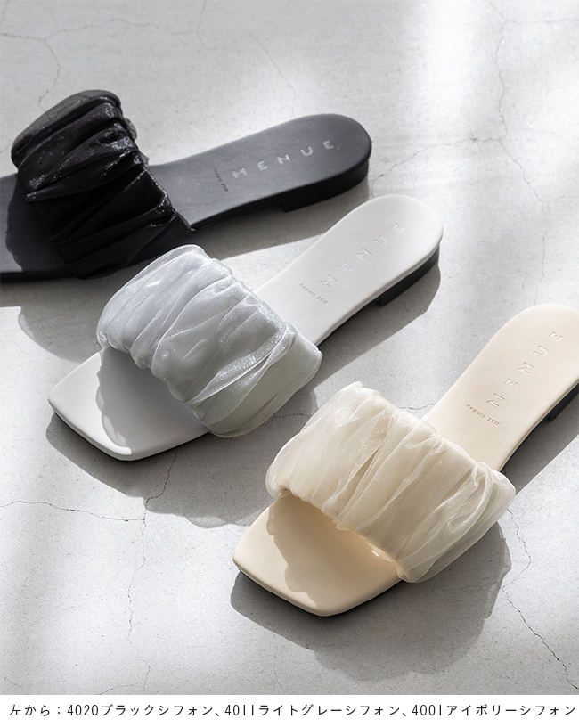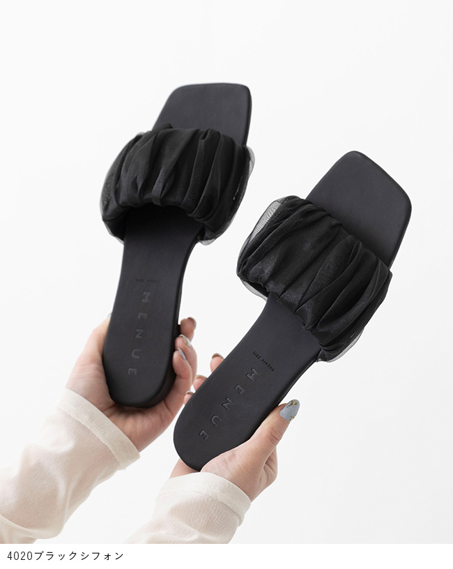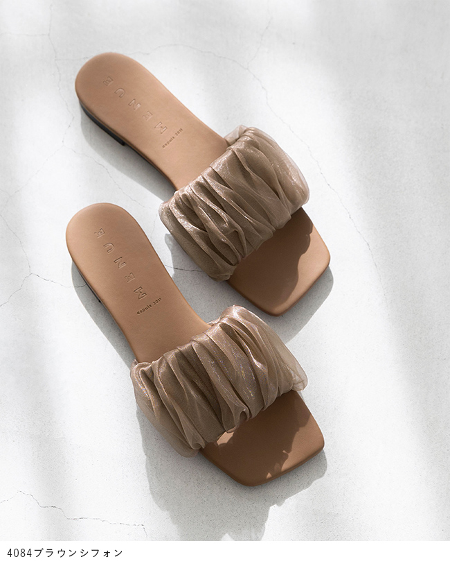 足元に華やぎと抜け感を。光を纏うシフォンサンダルで夏スタイルを更新 menue (メヌエ) スクエアトゥ フラット シフォンサンダル 送料無料