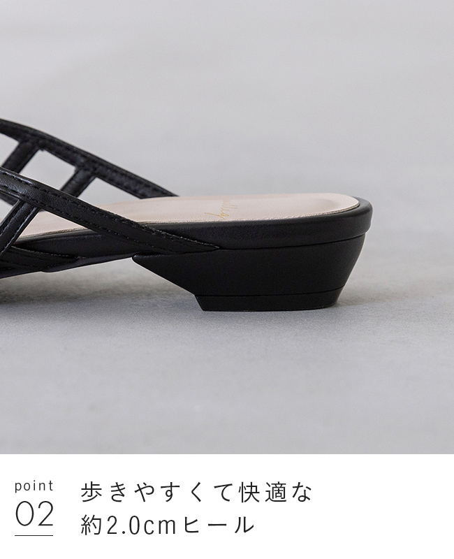 「ぺたんこすぎると逆に疲れる…」という方にも嬉しい、約2.0cmヒール。ほんの少しの高さがあることで姿勢も美しくキープ。
