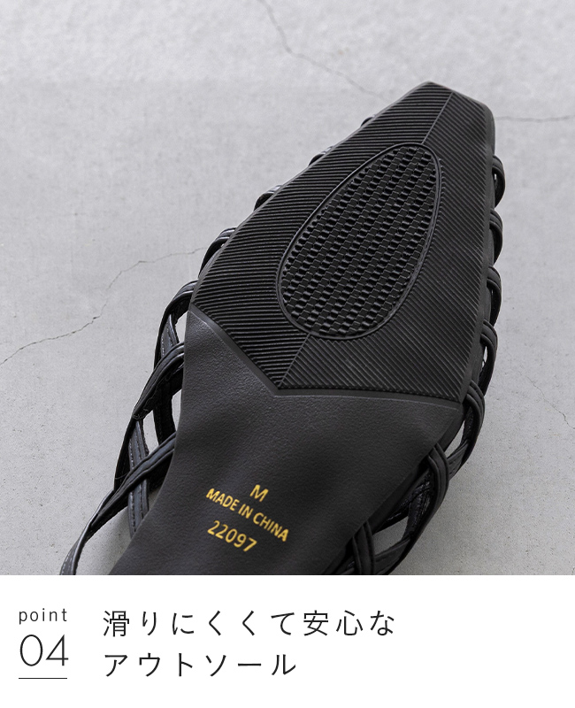 つま先は、シャープなラインが美しいスクエアトゥを採用。フラットに近い履き心地ながら、視線をスッと先へ流すことで、脚長効果を叶えました。