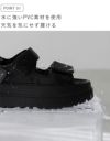 アッパー(表の生地)、中敷き、本底周りはレインシューズにも使われているPVC素材を使用。 水に強いので雨の日でも汚れや染みを気にせず履けます。 ビーチやアウトドアでも気兼ねなくおしゃれに! ※甲上部、プルストラップはPVC素材ではありません。