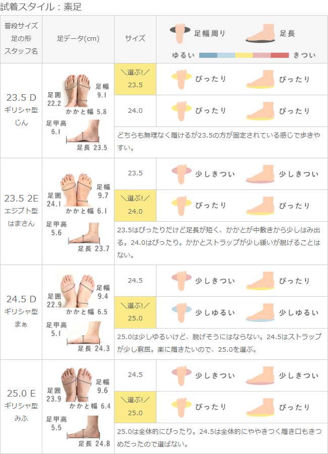 24.0は足幅にややゆとりのあるぴったり。23.5は足長にゆとりが少なく、ストラップがややきつめ。23.5も履けないことはないがゆとりを持って履きたいので24.0を選ぶ。