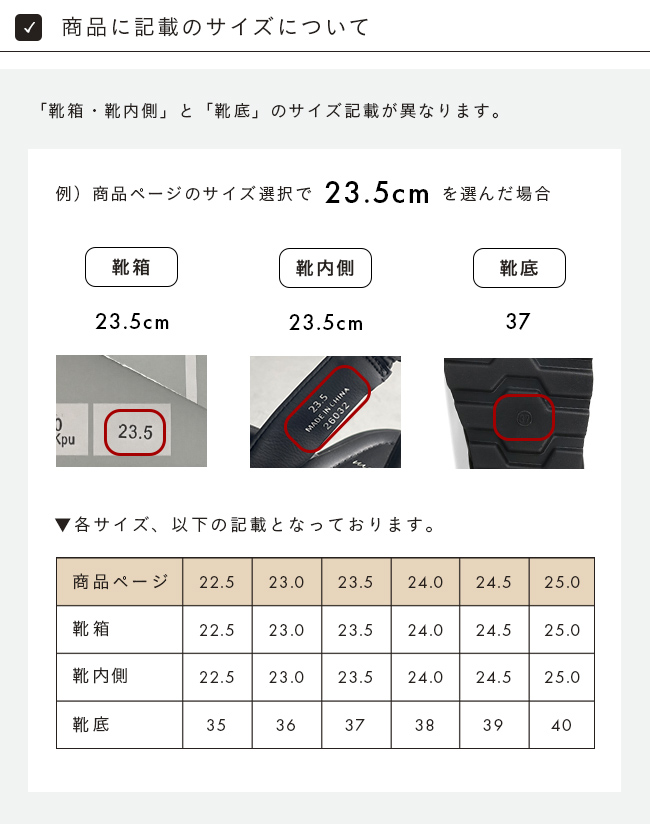 ※「靴底」と「靴箱・靴内側」でサイズ表記が異なります。