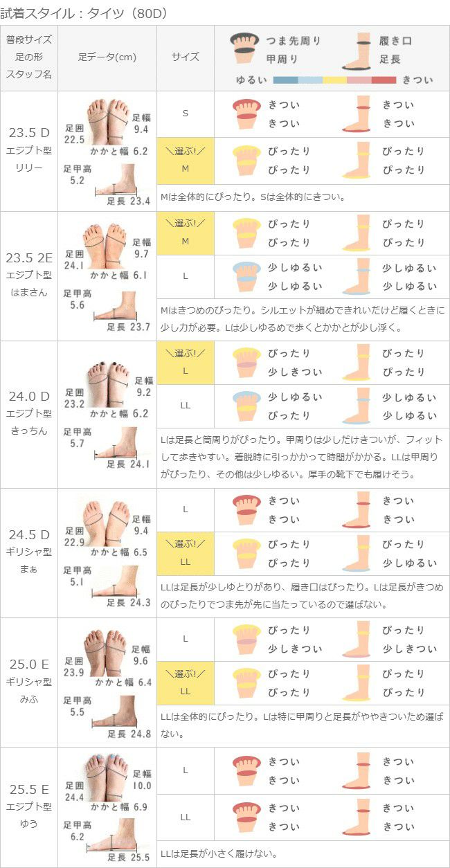 普段21.5cmのパンプス、ブーツは厚手の靴下を履くため22cmです。 足の長さは21.5です。足に肉がなく骨ぽいのでssでぴったりでした! 少しつま先が圧迫感がありますが履いてるうちに馴染んできそうなのでssでよかったです! 80デニールのタイツを履いてもちょうど良かったです!! ストレッチが効いてるので足首が痛くならないのでとっても良さそうです! 色違いも欲しくなりました!! スタッフさんのレビューとても参考になりました!