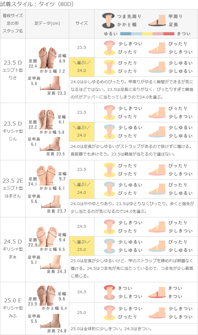 24.0はややゆとりあり。23.5はゆとりなくぴったり。歩くと指先が少し当たるのが気になるので24.0を選ぶ。