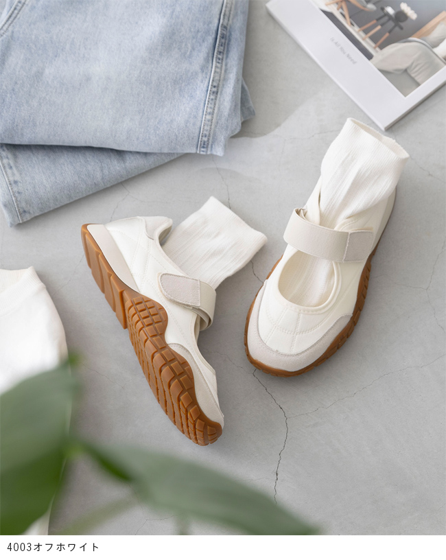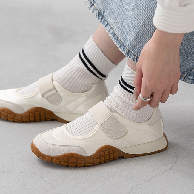 面ファスナーの貼り付け位置を自分のフィットするサイズ感に合わせておけば、ゴムストラップでいちいち外す手間なく、するっと脱ぎ履きできてとってもラクチン!