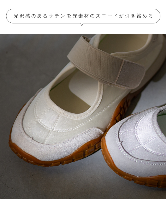ころんとかわいいメリージェーンにサテン×スエードの異素材を掛け合わせたトレンドライクなシューズ。