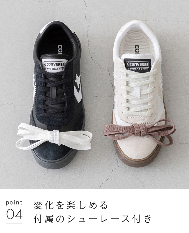 自由にカスタマイズできる異なるカラーのシューレース付き。その日の気分やコーデによって足元を違った雰囲気に変えられます。