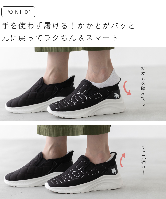 急いでいる時や両手がふさがっているときでもパッと履けちゃうハンズフリー仕様。