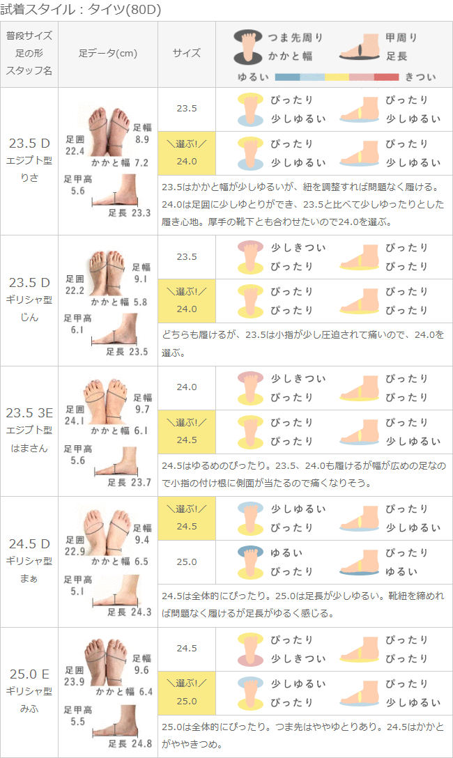 22.5は履き口がややゆるいが他は全体的にピッタリ。22.0は足囲が窮屈なので選ばない。
