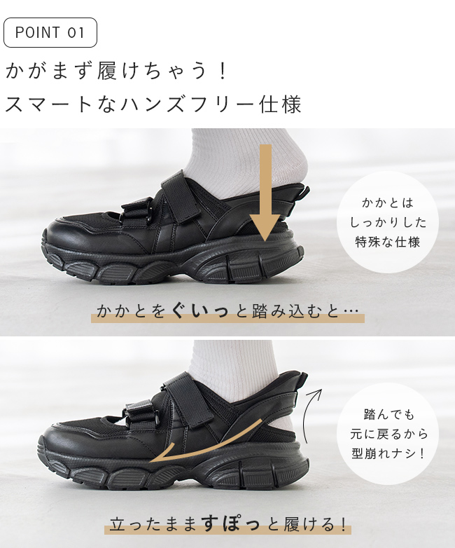 このスニーカーサンダルなら抱っこ中でも、両手が荷物で塞がっていても、ストレスなく「スポッ」と足入れ完了!