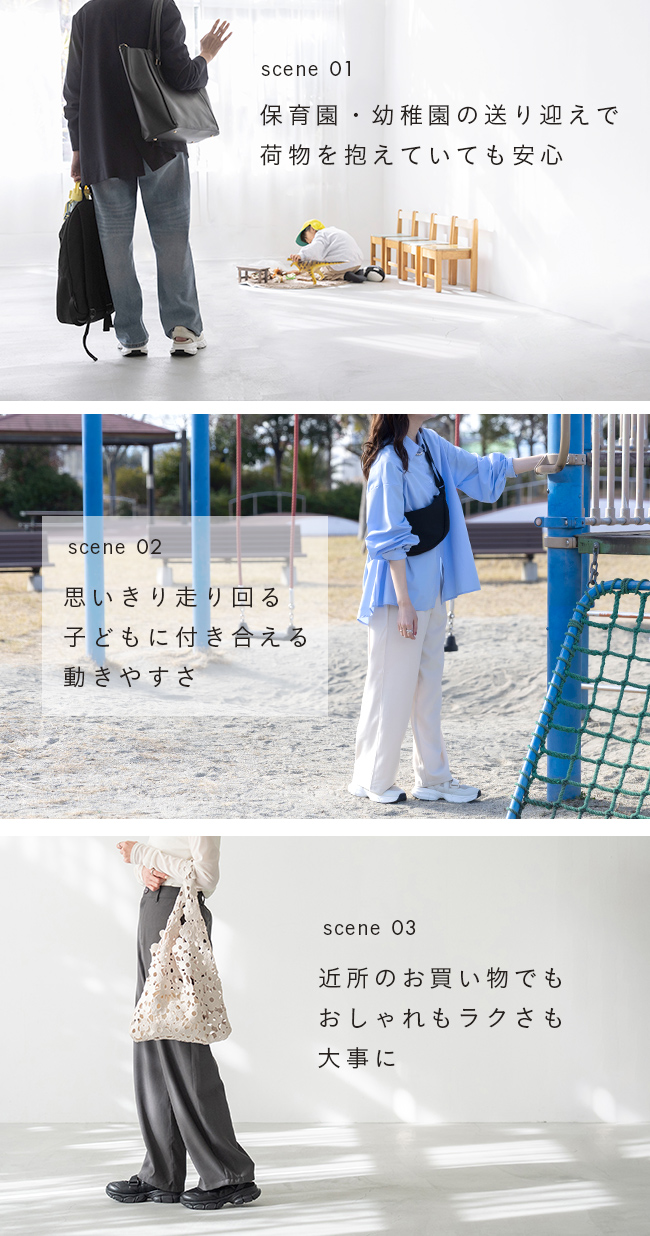 忙しい朝、荷物が多い日、子どもを抱っこしててもどんな時でも履くことができ、すぐに出かけられます。