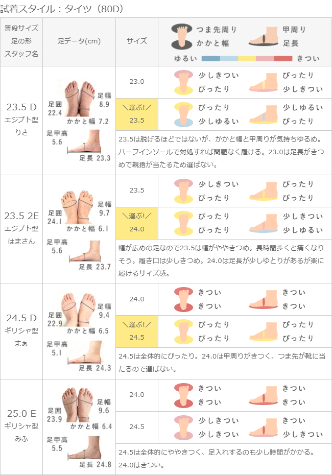 24.5は全体的にぴったり。24.0は甲周りがきつく、つま先が靴に当たるので選ばない。