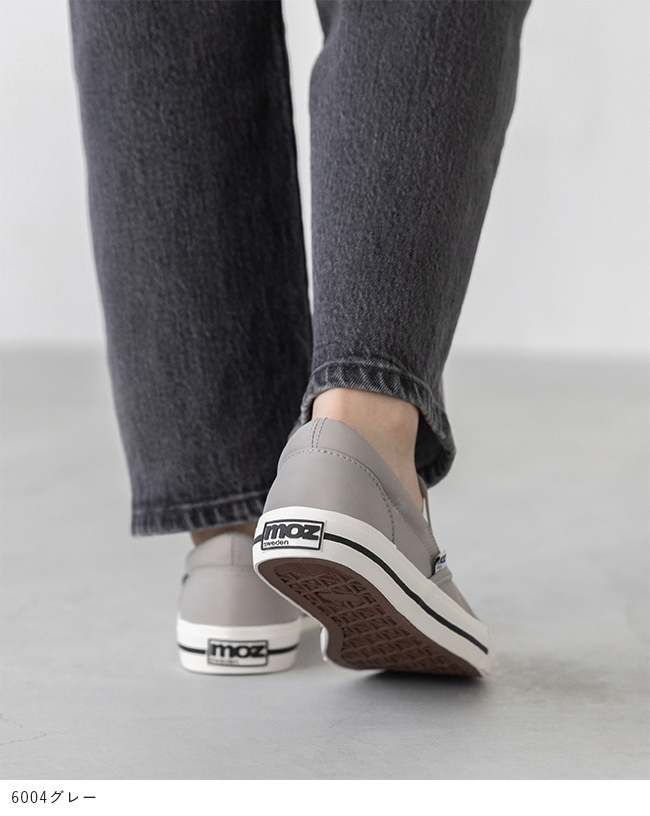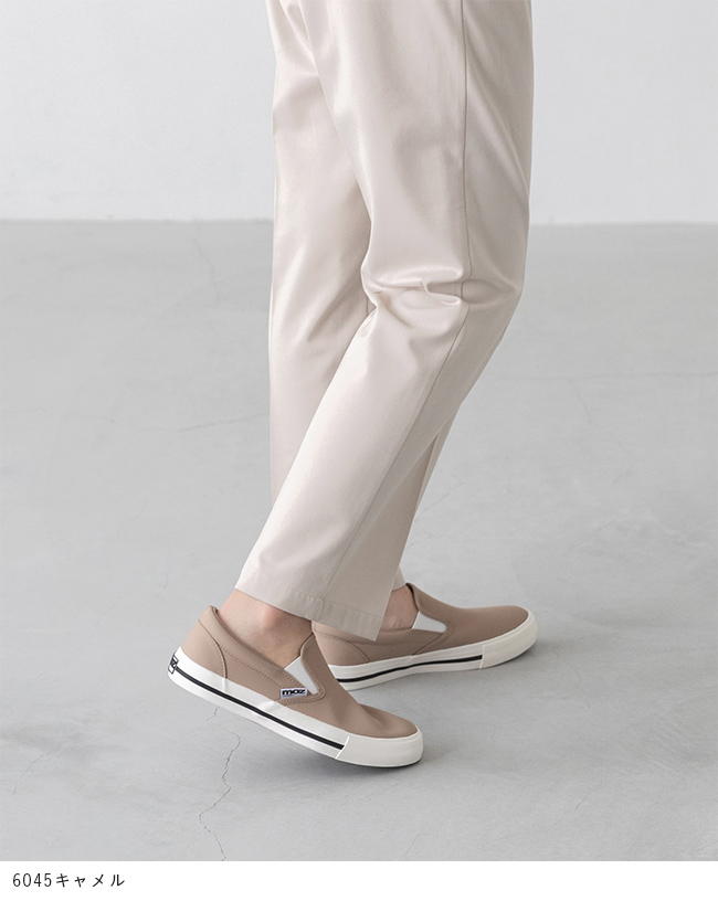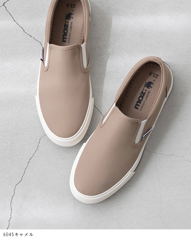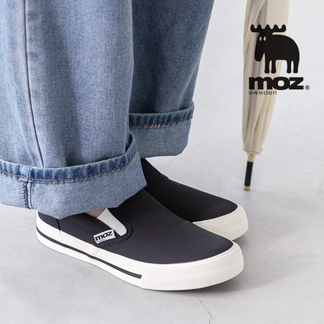 シンプルなデザインに、ヘラジカ「エルク」のロゴがワンポイントで可愛いブランドmozの晴雨兼用スリッポンスニーカー。