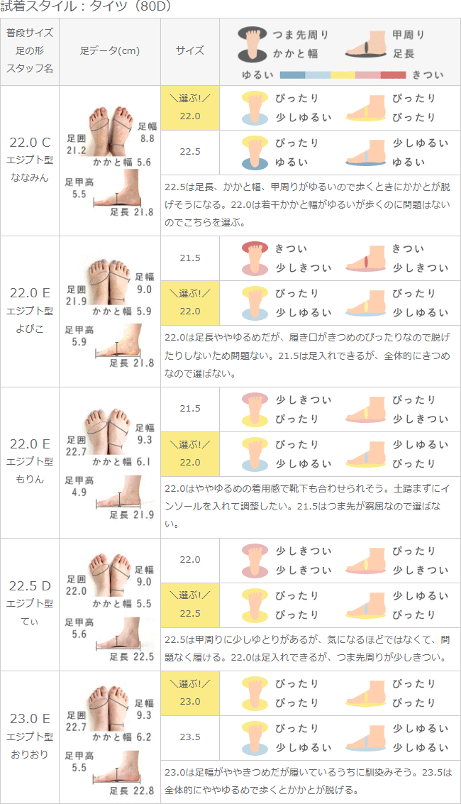 22.0はややゆるめの着用感で靴下も合わせられそう。土踏まずにインソールを入れて調整したい。21.5はつま先が窮屈なので選ばない。