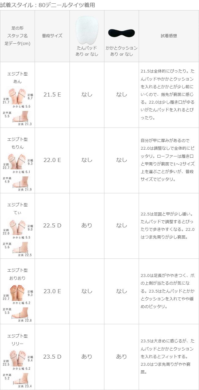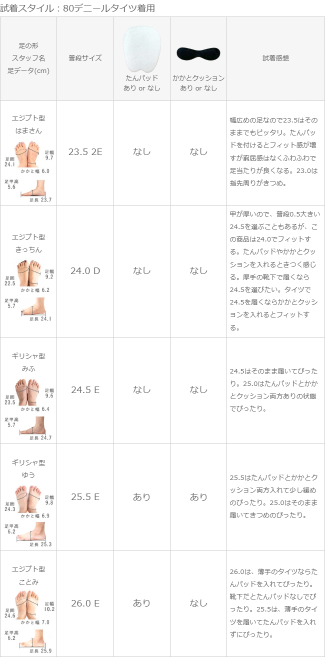 甲が厚いので、普段0.5大きい24.5を選ぶこともあるが、この商品は24.0でフィットする。タンパッドやかかとクッションを入れるときつく感じる。厚手の靴下で履くなら24.5を選びたい。タイツで24.5を履くならかかとクッションを入れるとフィットする。