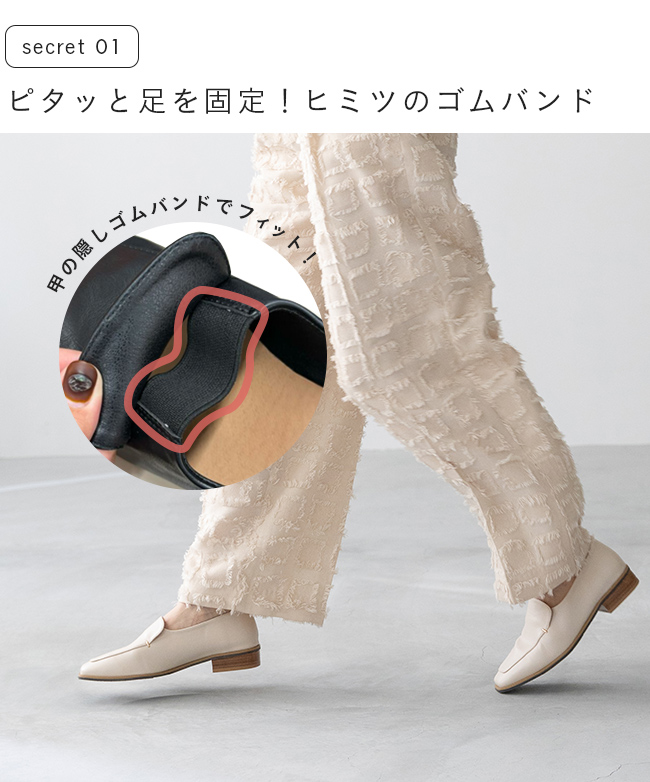 ヒミツのゴムバンドで、普通の足幅の方はもちろん、幅広さん幅狭さんどんな足の方にもフィット!