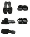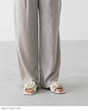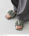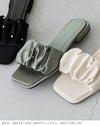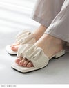トレンドのパールとギャザーを取り入れた旬サンダル。落ち着いた素材感の生地は他と中々かぶらない特別感。