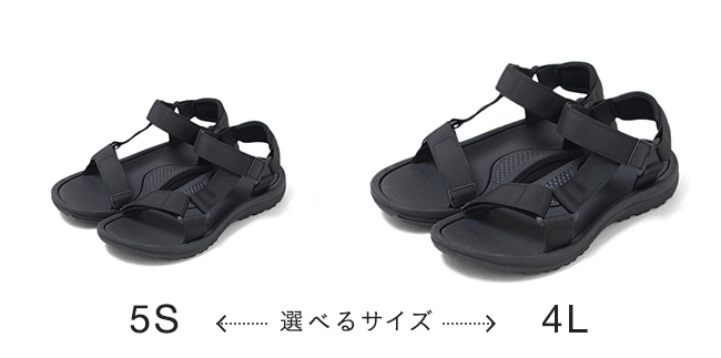 Lは足長がつま先とかかとに約5mmのゆとりがあるぴったり。LLは足長や前方のストラップがゆるい。