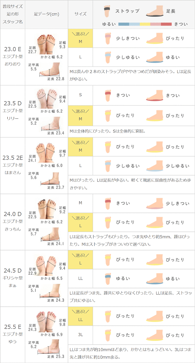 Lは足長がつま先、踵共にゆとりなくぴったり。LLは足長、ストラップ共にゆるい。