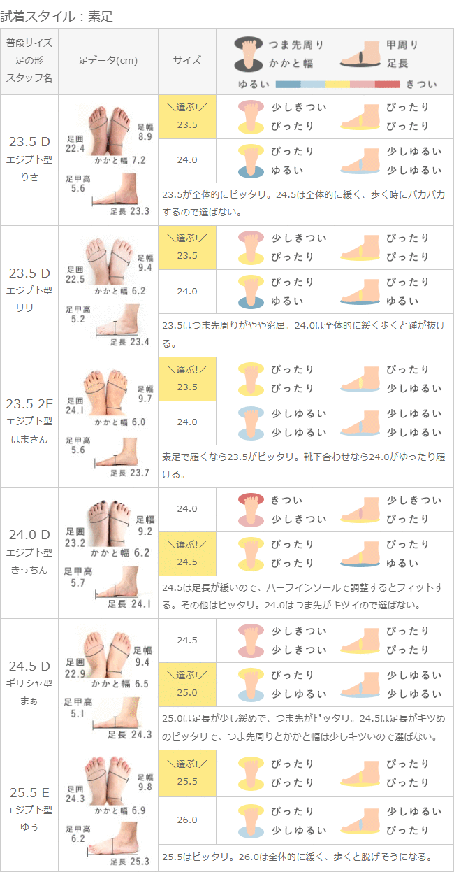 24.5は足長が緩いので、ハーフインソールで調整するとフィットする。その他はピッタリ。24.0はつま先がキツイので選ばない。
