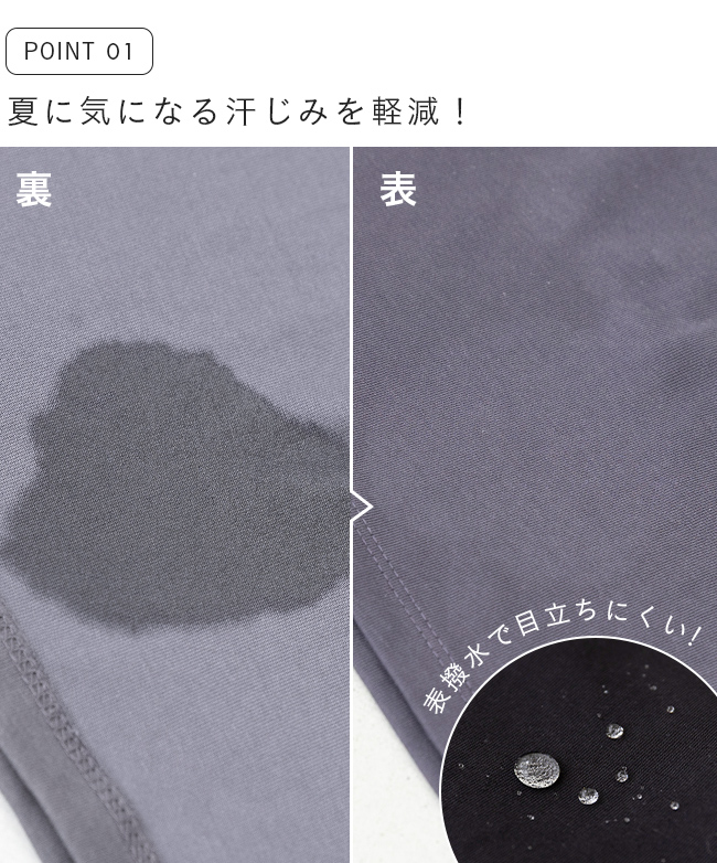 <表撥水加工> 汗じみ、表面の水滴や汚れを軽減するための表撥水加工を施しております。100%防げる加工ではなく、お洗濯やお取り扱いによって効果が徐々に弱くなりますので、あらかじめご了承ください。