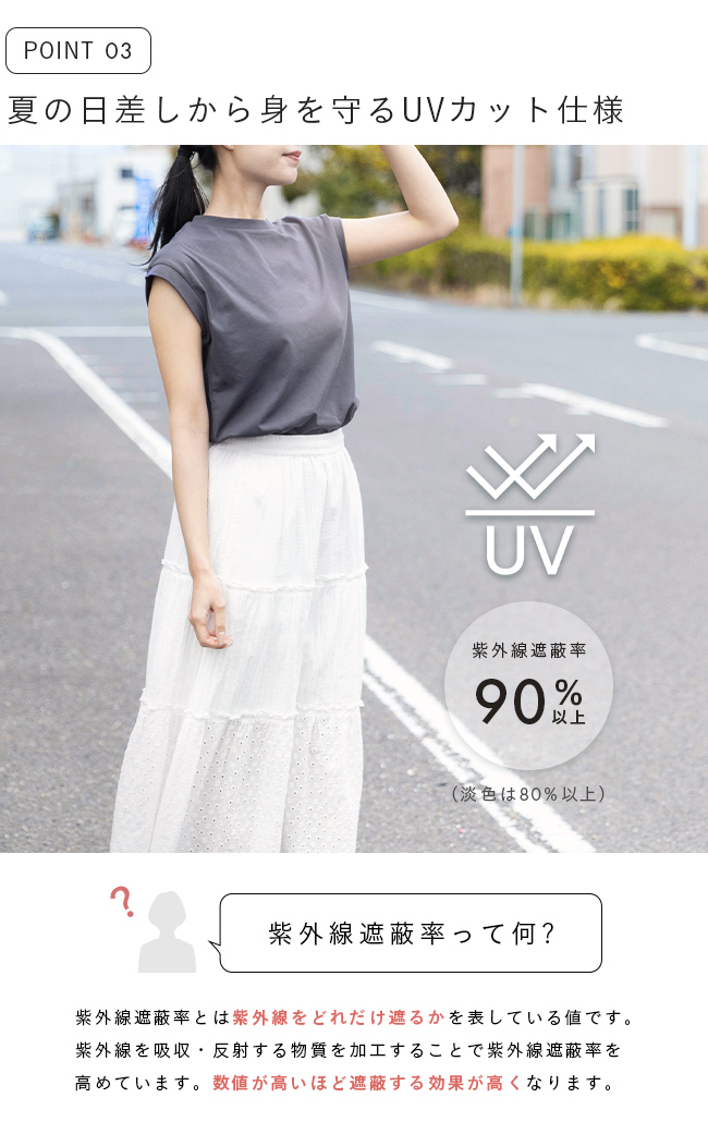 紫外線遮蔽率90%以上(淡色は80%以上)で、厳しい夏の日差し対策としてもおすすめです。